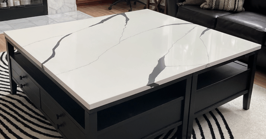 In this cozy family room, a custom Calacatta Black Vein Quartz coffee table becomes the centerpiece. This quartz features a crisp white background highlighted by elegant black and charcoal veining that echoes the look of high-end marble. Its polished surface resists stains from drinks and everyday use, making it as practical as it is eye-catching.