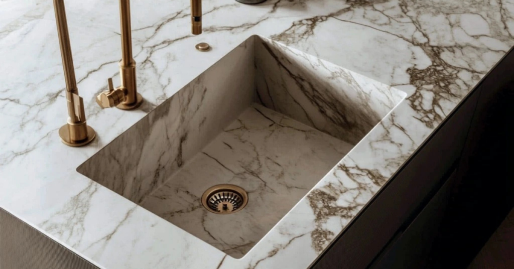 Integrated stone sinks follow the same philosophy. Especially in bathrooms and secondary kitchens, carved or seamlessly joined sinks eliminate breaks between materials. The result is a cleaner look that aligns with the broader preference for simplicity and cohesion.