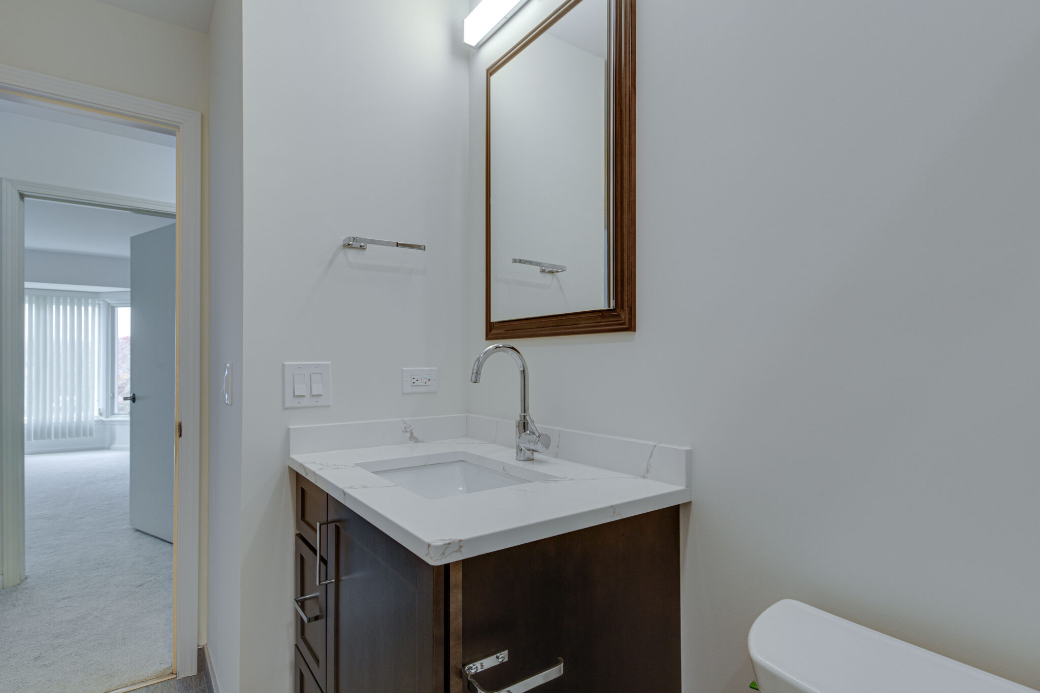 This bathroom vanity showcases the clean and refined look of Calacatta Mystic Quartz, a material known for its subtle veining and versatile design. The Quartz complements the warm cabinetry and sleek fixtures, creating a balanced and cohesive space. This durable, low-maintenance surface makes an excellent choice for a high-traffic area like a bathroom.