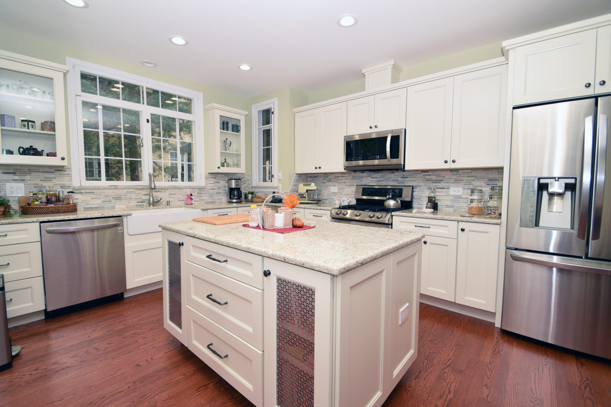 The warm and cool tones of Chakra Beige from Q-Quartz blended beautifully with ivory cabinets in this bright and spacious kitchen. We loved playing a part in making this welcoming kitchen come together!