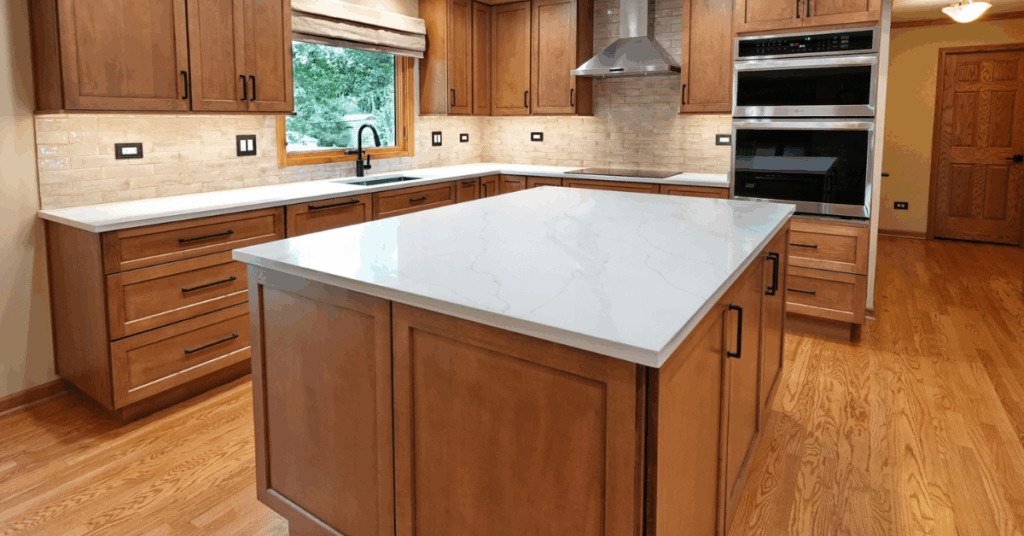 If you’re replacing your countertops, this is the perfect time to update your backsplash. Even a simple change—like replacing small tiles with a full-height quartz backsplash—can transform the entire kitchen.